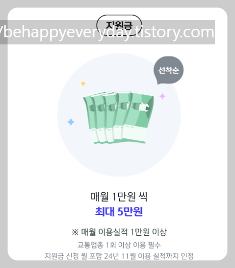 대중교통, 코레일, 하이패스 등 교통 관련 비용 매월 1만 원씩 최대 5만 원 지원합니다.
